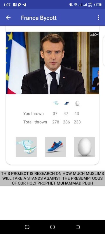 Stworzyliśmy tę aplikację dla świadomości i bojkotu Francji i wszystkich jej produktów. Trendem jest, że muzułmanie na całym świecie bojkotują wszystkie produkty „Made in France”. Bojkot wstrząśnie Francją i zmusi ją do przeprosin.