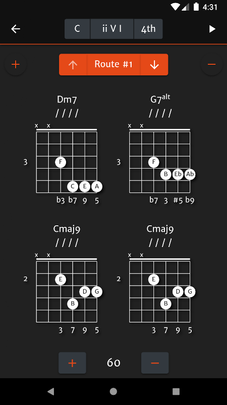 Aplikacja może odtwarzać progresję i wybraną przez Ciebie wariację wraz z metronomem. Możesz ustawić prędkość metronomu i postępować zgodnie z podświetleniem odtwarzanego akordu / diagramu.