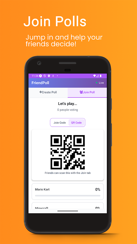 Głosuj natychmiast: Twoi znajomi po prostu wpisują kod lub skanują kod QR, aby dołączyć do ankiety. Nie potrzebujesz żadnych kont!
