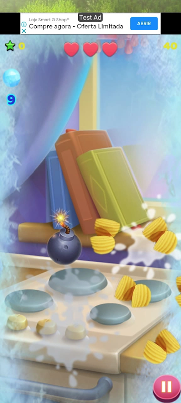 Avaliação: Corte tudo sem deixar nada cair, se cair mais de 3 alimentos você perde o jogo, tome cuidado com as bombas.