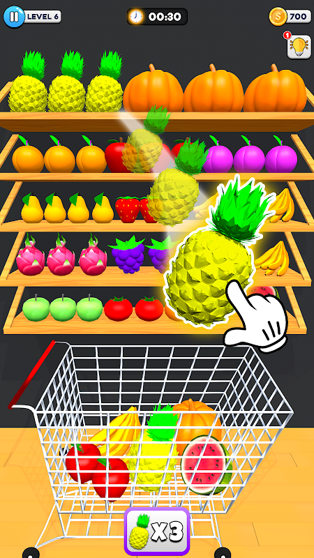 Chociaż początkowe poziomy mogą być łatwiejsze dla bystrych umysłów, gry w dopasowywanie owoców na wyższym poziomie przetestują Twoje logiczne myślenie, aby rozwiązać różne łamigłówki owocowe. Przeżyj przygodę z sortowaniem owoców w grze z oszałamiającą grafiką 3D, płynną rozgrywką i przyjaznym dla użytkownika sterowaniem. Rozwiąż kolorową łamigłówkę z relaksującymi i oszałamiającymi wizualnie animacjami oraz kojącymi efektami dźwiękowymi.