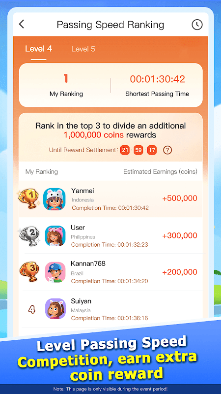 Konkurs szybkości przechodzenia poziomów: Codziennie podejmuj wyzwanie, aby ukończyć poziomy z największą prędkością i wygrać dodatkowe nagrody w postaci monet w oparciu o ranking szybkości ukończenia.