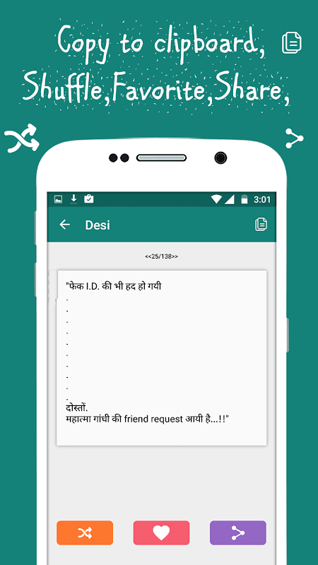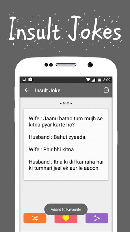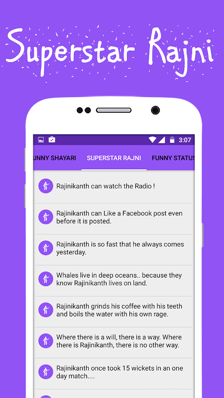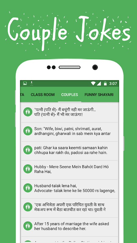 इस एप में नये हिन्दी मजेदार चुटकुले शामिल किये गये है. अलग अलग केटेगरी के हिसाब से सभी चुटकुलों को सही ढंग से पेश किया गया है.