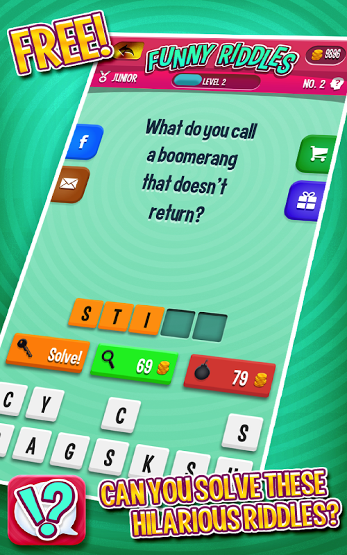 Do you know what a chicken's favorite vegetable is? Why, it's an eggplant, of course! You have no idea how funny riddles can be until you've tried this hilarious free quiz game. FUNNY RIDDLES is loaded with hours of puzzles, riddles, and puns that are guaranteed to have you and your friends roaring with laughter! Try it today!