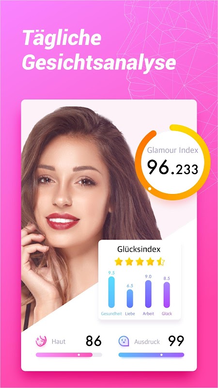 Jaki jest dziś Twój indeks urody? Jaka jest twoja skóra? Po wykonaniu lub przesłaniu zdjęcia przeanalizujemy Twoje rysy twarzy profesjonalną techniką, a następnie otrzymasz obszerny raport. W raporcie możesz zobaczyć swój indeks urody, stan skóry i wynik ekspresji. W międzyczasie istnieje również indeks miłości, zdrowia, fortuny i pracy oraz odpowiednie sugestie.