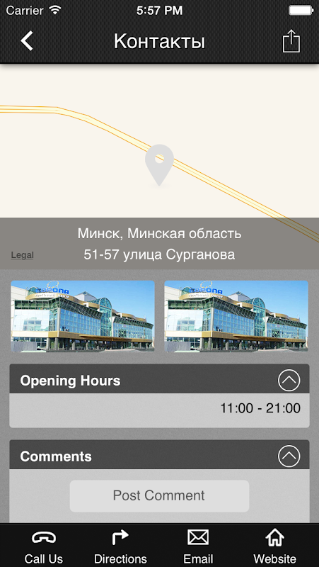 - фактический адрес и расположение на интерактивной карте города Минска, а при помощи встроенной GPS-навигации, каждый сможет добраться пешком, транспортом или автомобилем из любой точки Республики Беларусь;