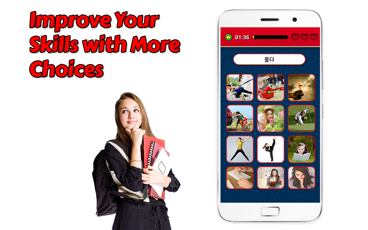 Tak więc Gra do nauki koreańskiego ma 2 zabawne gry . W grze możesz ćwiczyć akustyka koreański , aby lepiej zapamiętać słownictwo. Jedno słowo zostanie automatycznie wymówione, musisz posłuchać, co to jest, a następnie wybierz prawdziwy obraz, dotykając ekranu.