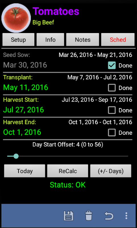 Stwórz swój osobisty ogród do zrobienia. Czas w ogrodzie oblicza dla Ciebie sugerowane daty (w oparciu o określone przez ciebie daty przymrozków), kiedy należy siać rośliny, z nasion lub roślin, kiedy przesadzić je do ogrodu oraz kiedy rozpocząć i zakończyć zbiór dla każdej wybranej rośliny.