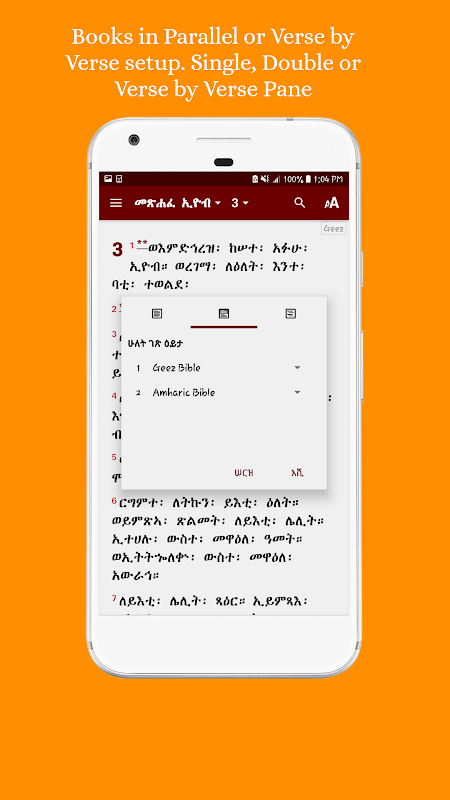 • የአማርኛ፣ የግእዝና የእንግሊዝኛ ዕትሞችን ጎን ለጎን፣ መስመር በመስመር ፣ ከላይና ከታች አድርገን ለማንበብ ያስችላል።