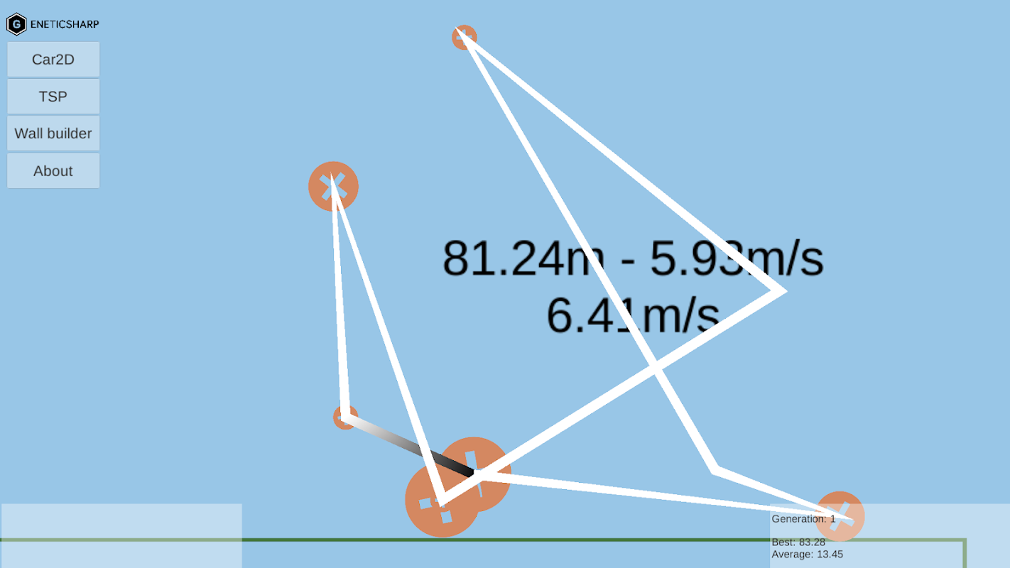 Próbka ta bazuje na słynnym BoxCar2D, który wykorzystuje algorytm genetyczny do tworzenia projektów samochodów, aby przezwyciężyć wyzwania na drodze, takie jak luki, wzniesienia i przeszkody.