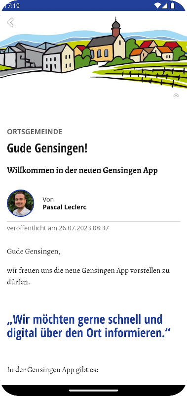 Nasza platforma komunikacyjna wokół Gensingen. Bądź na bieżąco z tym, co dzieje się w naszej społeczności. Lokalne społeczności, stowarzyszenia, kościoły i grupy interesu dostarczają informacji. Nigdy więcej nie przegap wydarzenia dzięki kalendarzowi wydarzeń. Połączony i lokalny.