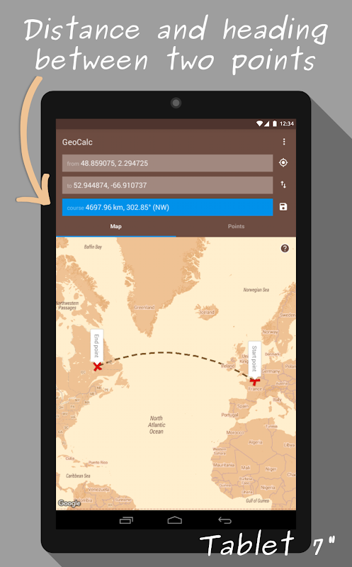 GeoCalc oblicza współrzędne geograficzne podane punkt początkowy, odległość i nagłówek, lub oblicza odległość i pozycji pomiędzy dwoma punktami. Obliczone współrzędne mogą być ustawione jako początkowych współrzędnych, umożliwiając szybki kolejnych obliczeń.