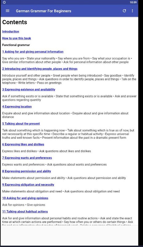 A particular feature of the book is the two-fold approach to the language, linking the communicative skills to the learning of grammar. The Functional grammar consists of 21 units illustrating the various uses to which the language can be put – for example giving instructions or talking about the recent past. The more traditional Reference grammar deals with grammatical structures, such as the imperative or the perfect tense. A few points not covered in the Functional grammar are to be found in the Reference grammar.