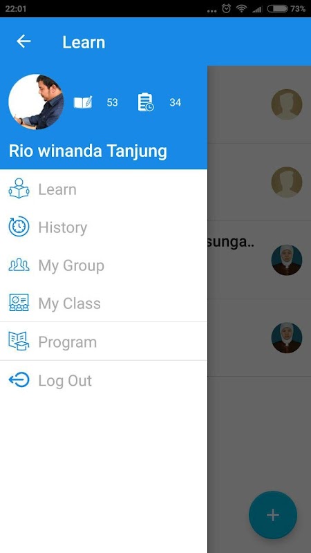 Untuk belajar Materi dan Latihan, klik + dipojok kanan bawah akan muncul list Materi dan Latihan Teacher yang telah di follow. Apabila belum follow Teachernya, Cari dan Follow
