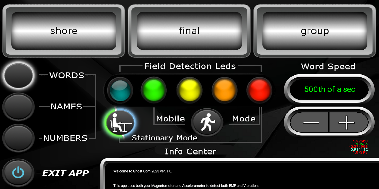 Ta aplikacja wykrywa zarówno pole elektromagnetyczne, jak i wibracje jako fizyczne dane wejściowe ze świata paranormalnego.
