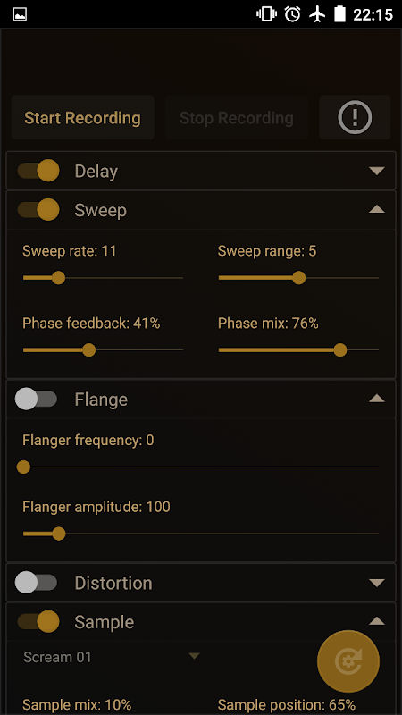 Aplikacja ma domyślne ustawienia efektów, które mogą być zmienione i zapisane. Można także wyświetlić wykres audio dla oryginalnego nagrania i przetworzonego pliku.