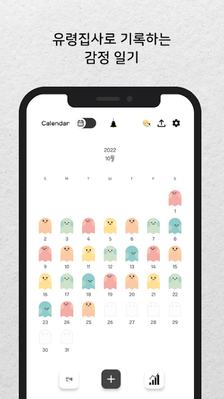 유령집사 캐릭터로 기분을 기록하고, 달력에서 한눈에 확인해보세요. 일기를 각 감정별로 분류하는 것도 가능해요.