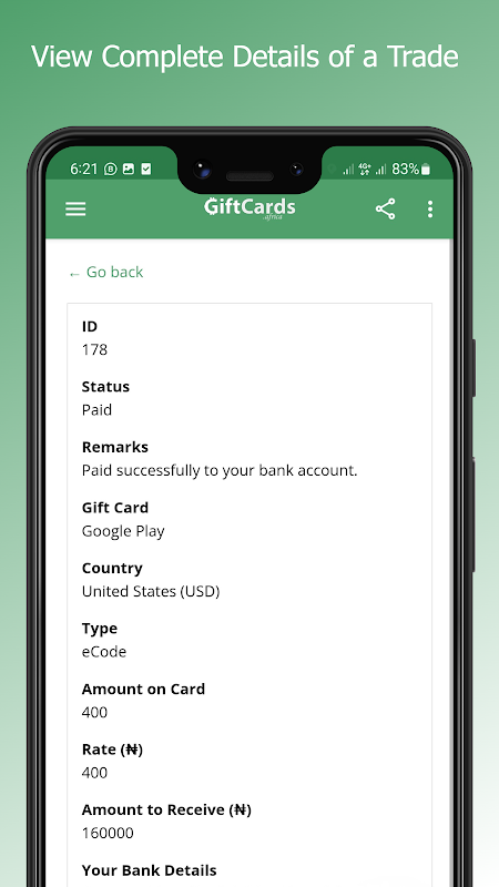 Nasza platforma jest przyjazna dla użytkownika, a doświadczenie handlowe, które dzięki nam uzyskasz, nie ma sobie równych. Po pierwsze, musisz założyć u nas konto, aby móc dokonać transakcji. Po drugie, musisz odwiedzić stronę „sprzedaj karty podarunkowe” i podać dane swojej karty podarunkowej. Po trzecie, zrelaksuj się, poczekaj i otrzymaj płatność bezpośrednio na swoje konto bankowe natychmiast po potwierdzeniu.