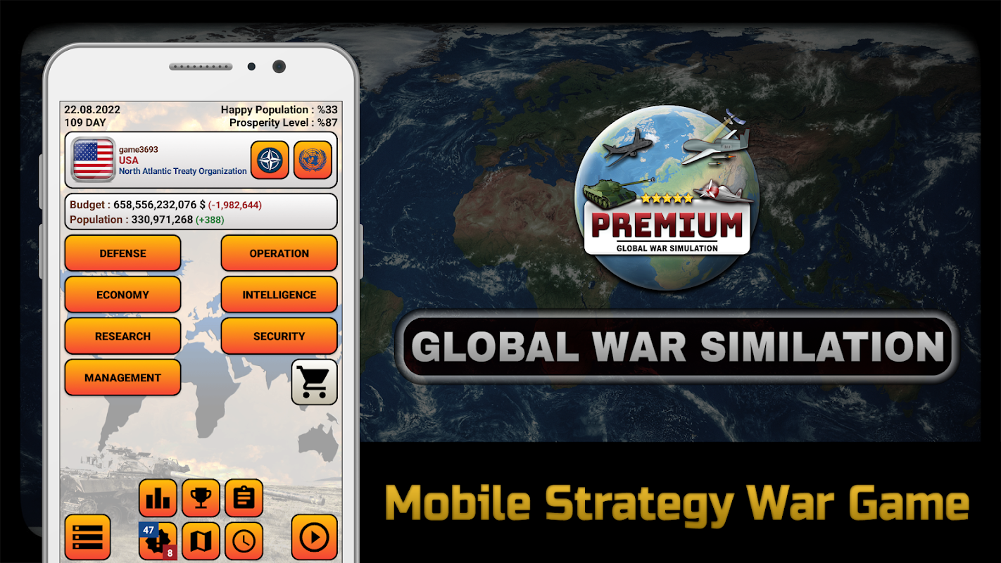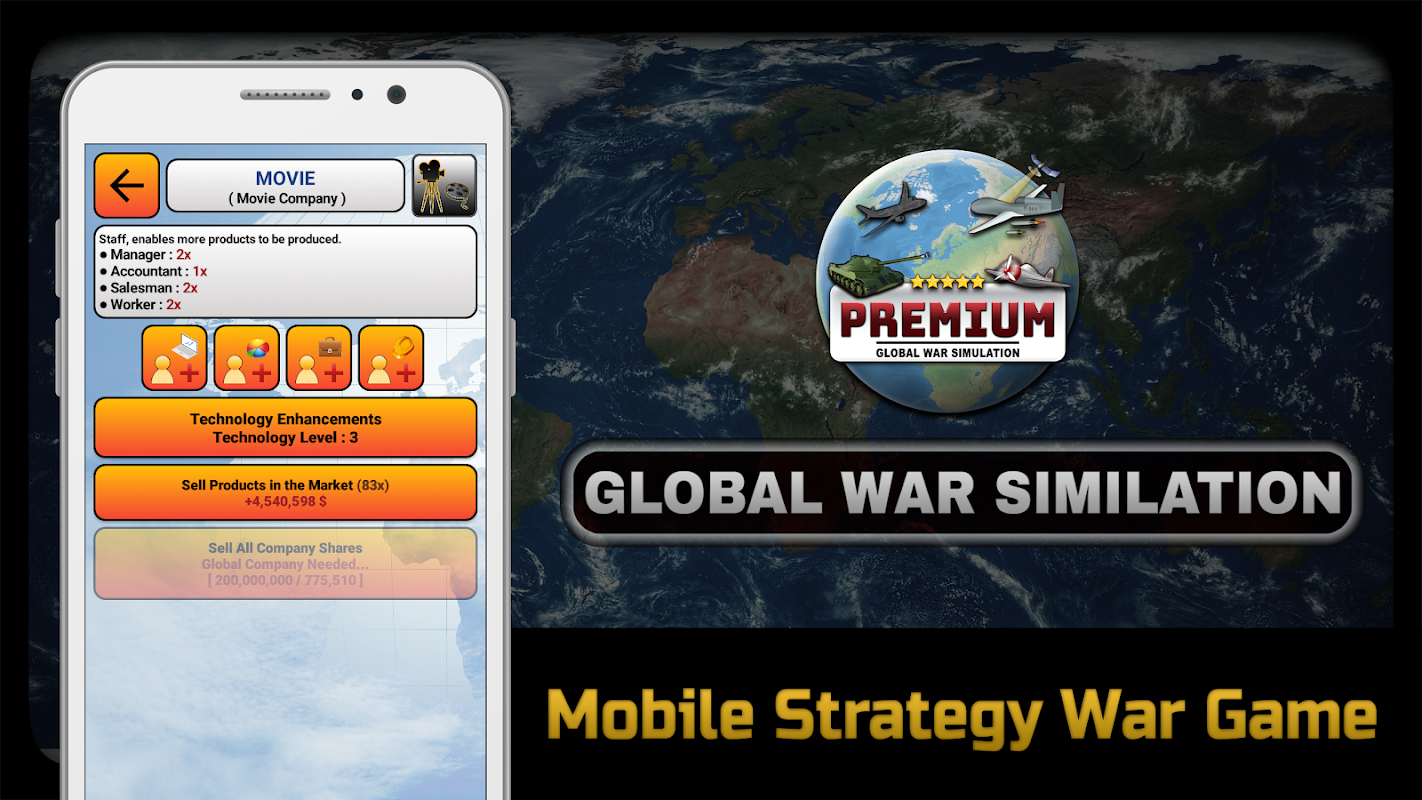 Global War Simulation Premium to bardzo udana gra w kategoriach współczesnej gry wojennej, strategii wojskowej, gry symulacyjnej i gry typu tycoon na telefony komórkowe i tablety.