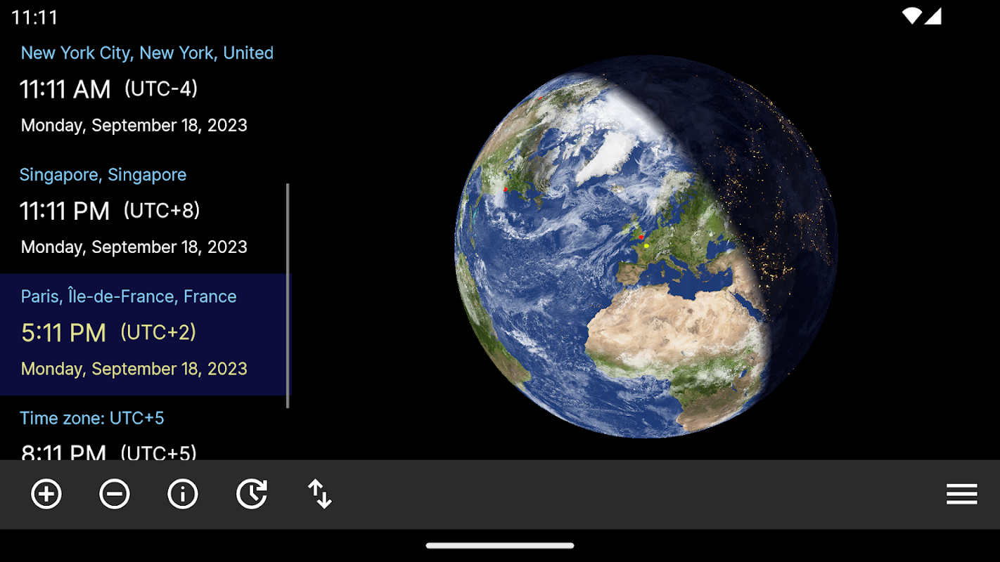 Ta aplikacja dostarcza informacji na temat czasów lokalnych w miastach na całym świecie. Dodatkowo pokazuje Ziemia jest więc bardzo proste, aby dowiedzieć się, czy jest dzień czy noc w czasie w określonych lokalizacjach. Jest możliwe, aby wybrać miasto i kula obraca się tak, że wybrane miasto jest w centrum miasta.