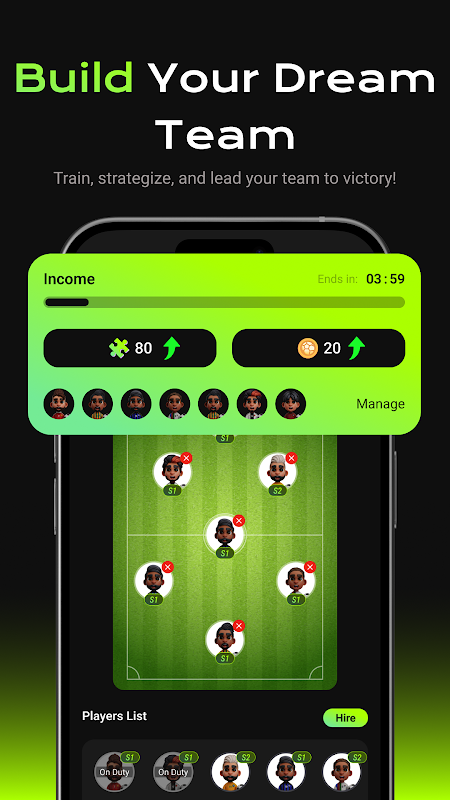Zbuduj swój wymarzony zespół: zatrudniaj, ulepszaj i zarządzaj graczami za pomocą unikalnych statystyk. Stwórz swój najlepszy skład, który poprowadzi Cię do zwycięstwa!