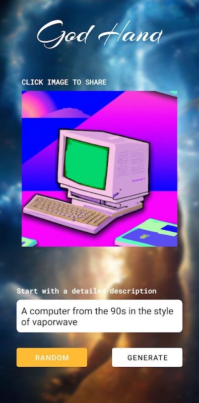 Wypróbuj tę zabawną i najbardziej oczekiwaną aplikację Ręka Boga - AI Image Maker, która pozwala generować obrazy z tekstów. Możesz albo wpisać własny tekst, aby wygenerować obrazy z tych tekstów, albo wygenerować losowy obraz. Po prostu opisz, co chcesz zobaczyć, a Ręka Boga ożywi to.
