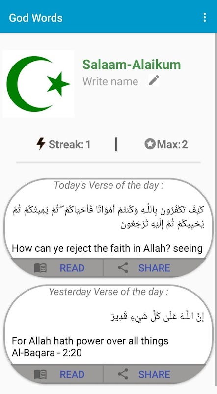 * Islam: God Words zawiera również pełny Koran z arabskimi pismami, fonetyką i tłumaczeniami, abyś mógł również nauczyć się znaczenia.