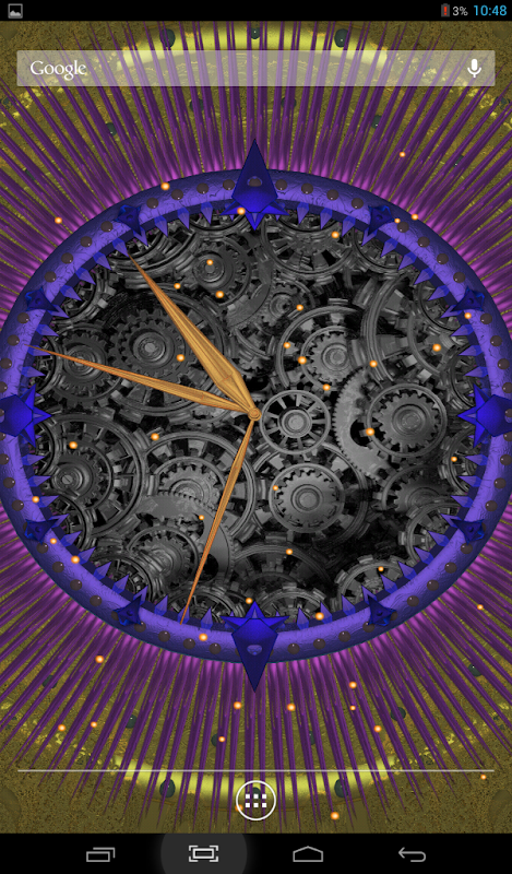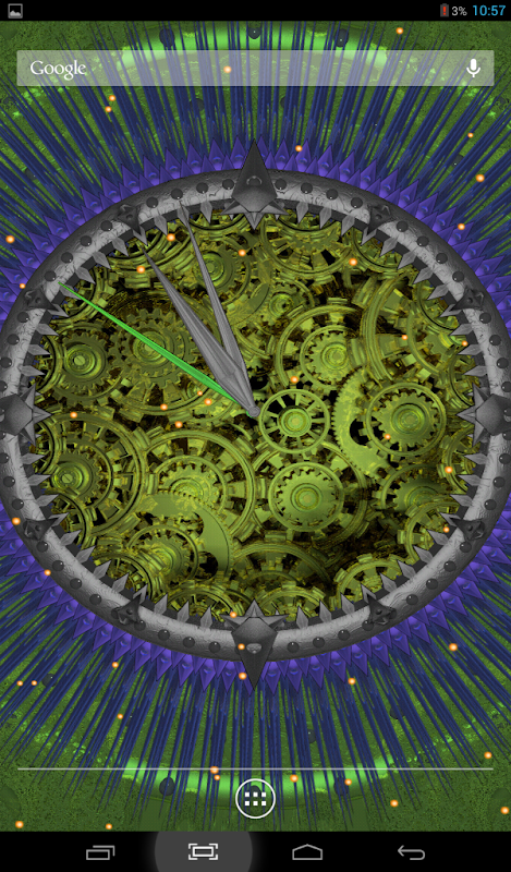 You can choose color of background plate, color of ring, select quantity and color of two layers rotating needles, color of central gears, and color of each hand, choose color and quantity of particles, flying above. Also You can select speed of gears and needles and choose one of two types of particles behavior to customize your wallpaper. Great original 3d hd live wallpaper.