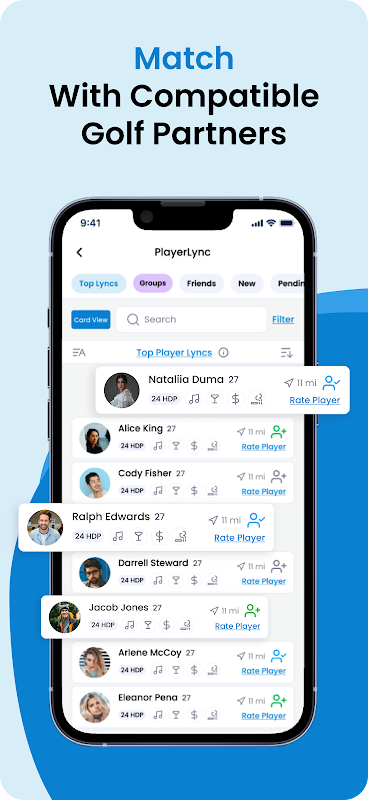 • Skorzystaj z zaawansowanych algorytmów GolfLync, aby znaleźć partnerów golfowych z podobnym handicapem, od golfistów rekreacyjnych po profesjonalistów PGA i LPGA, którzy pasują do Twojego stylu gry w golfa i zainteresowań golfowych.