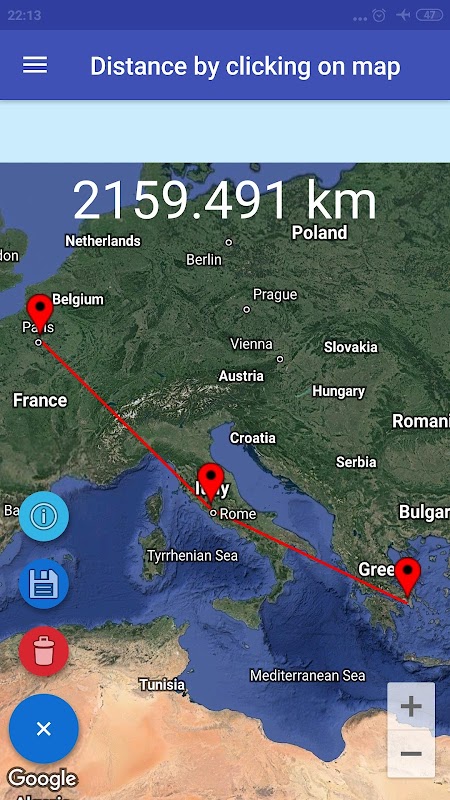 5. Znajdź odległość w linii prostej między dwoma punktami za pomocą współrzędnych oraz między dwoma lub więcej punktami, klikając mapę. Możesz zapisywać i zarządzać odległościami.