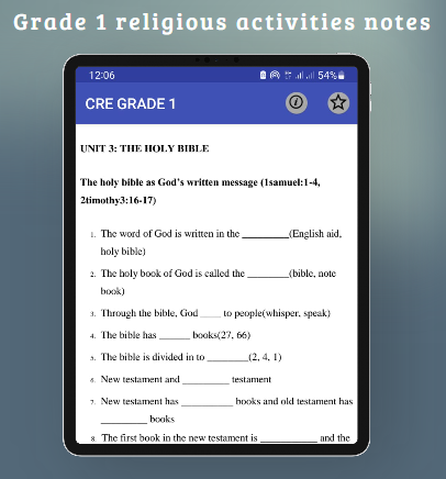 GRADE 1 CRE {CURRICULUM BASED CURRICULUM - CBC} Aplikacja mobilna pomaga uczniom w klasie 1 w ich powtórce egzaminacyjnej. Ta aplikacja zawiera następujące treści w sylabusie: