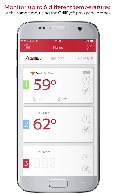 Aplikacja GrillEye® została specjalnie zaprojektowana do współpracy z termometrem do grillowania i palenia GrillEye® Smart Bluetooth®. Pozwala na monitorowanie grilla lub wędzarni, podczas gdy Ty odpoczywasz z przyjaciółmi i rodziną. Gdy tylko temperatura żywności osiągnie żądany poziom, GrillEye® wysyła powiadomienie do urządzenia iOS.