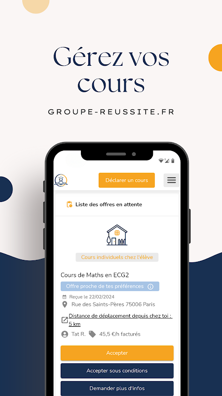 Dzięki aplikacji Groupe Réussite zyskaj płynność i czas w zarządzaniu prywatnymi lekcjami przez cały rok i intensywnymi kursami w czasie wakacji szkolnych.