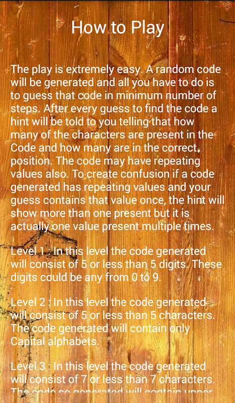 Level four deals with codes containing numbers as well as capital and small alphabets.