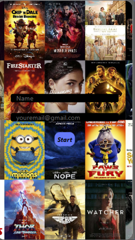 Aplikacja Guess the Movie to aplikacja służąca do odgadywania filmu na podstawie obrazu. Gdy wpisz swoje imię i nazwisko oraz adres e-mail, a następnie kliknij przycisk Start.