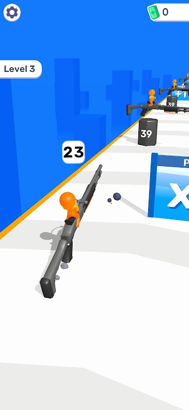 - Przesuń w lewo i w prawo, aby zebrać nowe pistolety do jazdy!