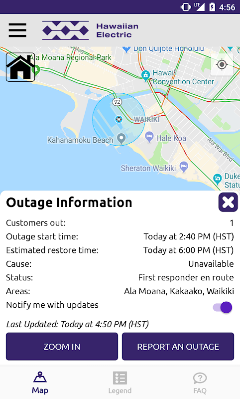Aplikacja mobilna Hawaiian Electric lub HECO to doskonały sposób na przeglądanie informacji o znanych awariach na wyspie Oahu i Maui County. Uzyskaj aktualne informacje o awariach, takie jak obszary, których to dotyczy; liczba klientów, których to dotyczy; i szacowany czas przywracania. Otrzymuj ważne informacje od Hawaiian Electric dzięki naszej usłudze powiadomień i powiadomień. Otrzymuj powiadomienia o awariach w pobliżu Twojej bieżącej lokalizacji, korzystając z funkcji geolokalizacji na urządzeniu mobilnym i zarejestruj się, aby otrzymywać powiadomienia o konkretnej awarii. Możesz również zgłosić awarię bezpośrednio lub uzyskać dostęp do linii alarmowych Oahu lub Maui County z aplikacji mobilnej.