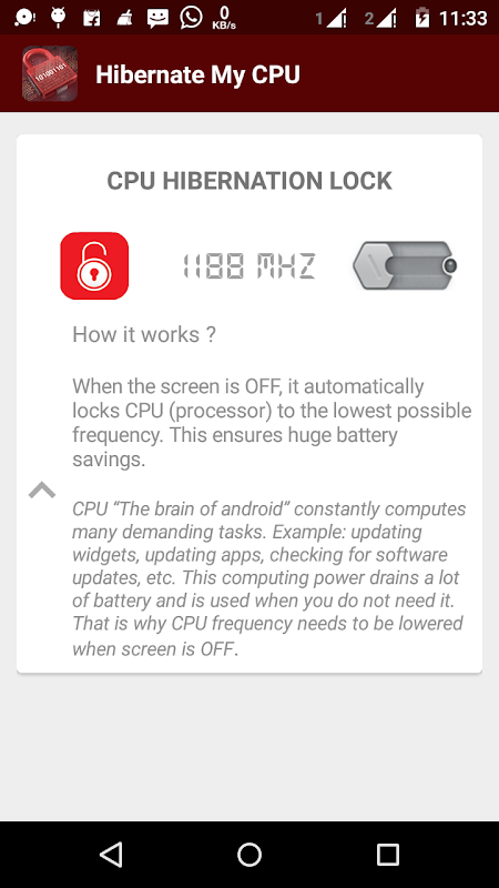 When the screen is OFF, it automatically locks CPU processor to lowest possible frequency. This ensures huge battery savings.
