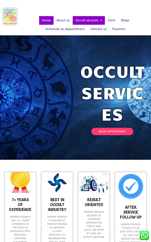 Hidden Sensess is working in occult science started by Vaibbav Gosavvi in year 2020. He completed his reiki up to 3 levels, Pendulum Dousing, Numerology, Vastushastra and finger print analysis in this year. He also have 15+ years of expertise in the field of Astrology with 1000+ satisfied customers from all over India.