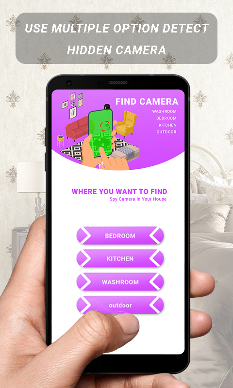 Otwórz kamerę i przesuń telefon do różnych obiektów, takich jak lampka nocna na ekranie telewizora, klimatyzacja, podgrzewacz wody i sprzedaż lub inne miejsce w pokoju, skanowanie, gdy aplikacja wykryje ukryte urządzenia, ukryta aplikacja wykrywająca kamerę, ukryte mikrofony i niania aparat i Szpieg dzieci i błysk.