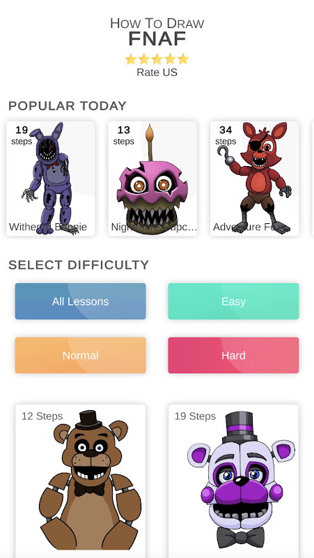 Nauka rysowania jest nie tylko interesująca, ale także przydatna. Od dawna udowodniono, że samokształcenie pomoże rozwinąć pamięć i wyobraźnię. Rysowanie to świetny sposób na oderwanie się od problemu. Więc szybko pobierz naszą aplikację "Jak narysować FNAF" i rozwijaj się!