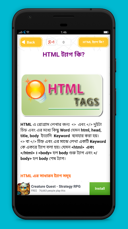 শিখে প্রোগ্রামিং শুরু করে চান তারা অনায়াসে এই অ্যাপ থেকে এই ল্যাঙগুয়েজ শিখতে পারবেন । এইচটিএমএল শিখতে দরকার হবে না কোন প্রোগ্রামিং বই ।