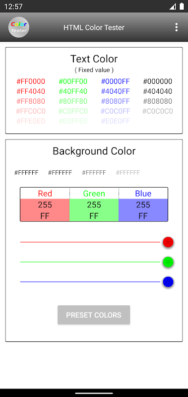 Za pomocą paska wyszukiwania (czerwony, zielony, niebieski), który obsługuje kod koloru HTML, możesz dowolnie zmieniać kolor tła tej aplikacji. Możesz także użyć przycisku PRESET COLORS, aby zmienić jeden z ustawionych kolorów tła.