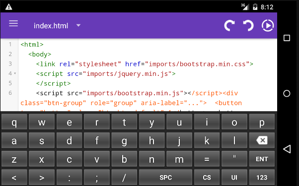 Aby praca programista łatwo ta aplikacja ma niestandardową klawiaturę, gdzie użytkownik może wygenerować CSS i HTML tagów za pomocą jednego kliknięcia. Ta aplikacja zawiera podstawowe przykłady Bootstrap, angularjs i jQuery. Ponadto ta aplikacja posiada kilka przykładów menu mobilnych.