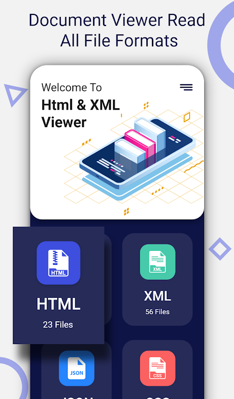 Teraz nie musisz znajdować plików XML i HTML wszędzie w menedżerze plików telefonu, otwieraczu dokumentów HTML i XML - wyświetlaj pliki XML i HTML aplikacja wyszukuje i wyświetla wszystkie pliki HTML i XML dostępne w pamięci urządzenia w jednym miejscu . Nasz czytnik plików wyświetla listę wszystkich dokumentów XML i HTML zawartych w telefonie i kategoryzuje każdy plik HTML i XML indywidualnie, dzięki czemu możesz łatwo przewijać i otwierać odpowiedni plik HTML lub XML w dowolnym miejscu i czasie. Nasz program do otwierania plików HTML i XML - przeglądaj dokumenty XML i HTML ma bardzo prosty i przyjazny dla użytkownika interfejs. Możesz czytać pliki XML i HTML za pomocą eleganckiego ekranu czytnika, aby zapewnić przyjazną dla użytkownika czytelność.