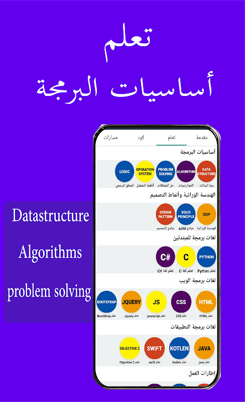 Charakterystyczna i prosta aplikacja do nauki podstaw programowania w języku arabskim, ponieważ aplikacja zawiera podstawowe wejście do programowania dla każdego początkującego w dziedzinie programowania oraz wiele pytań i odpowiedzi programistycznych, które przyniosą korzyści każdemu początkującemu programiście i zawierają ważne definicje i pojęcia dotyczące każdego programisty, który chce zostać profesjonalistą w dziedzinie programowania, a także zawiera treści mające na celu nauczanie algorytmów inżynierii genetycznej, różnych systemów operacyjnych, logiki naukowej oraz stron, które każdy programista potrzebuje na swojej drodze do świata programowania i języków programowania dla wszystkich dyscyplin programowania, takich jak Python, C, C#, języki frontend i backend dla twórców stron internetowych, języki aplikacji, takie jak Android i iOS, a także zawiera listę sieci i listy Inne związane z frameworkiem dla języków programowania takich jak filtry i laravel oraz wyjaśnienia innych frameworków, takich jak Xamarin i inne