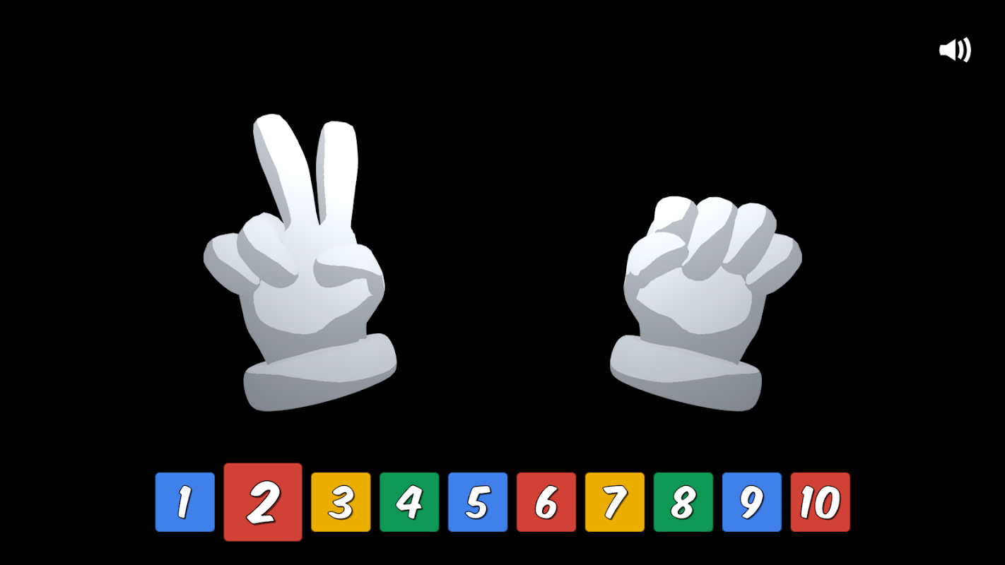 I Can Count To Ten uses changing sounds, color, and animation to attract and maintain attention and encourages the child to mimic what they see on the mobile device screen. The user interface consists of a screen with a black background, and a set of 3-D animated hands in the foreground that look similar to the cartoon hards of Mickey Mouse. A repeating animation shows the progression of retracted and extended fingers from 1 to 10, and a voice speaks each number aloud as each finger extends or retracts. If the child interacts with the mobile device screen by tapping or swiping, the animation will react accordingly, moving back, and forward to the correct number.