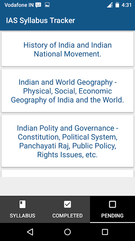 An indispensable app for all serious UPSC Civil Services Aspirants created by experts. Using this app. you can not only see the latest syllabus of UPSC but you can also track your progress on topics in syllabus. You can track your progress in all four General Studies(GS) papers as well as prelims GS paper.