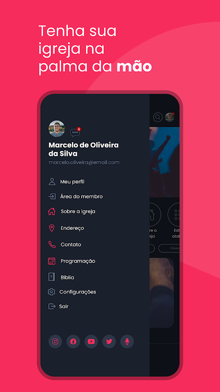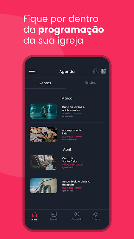 Resources available in the Application: News, Church Agenda, Events, Contents, Projects, Live Transmission and Teaching Module.