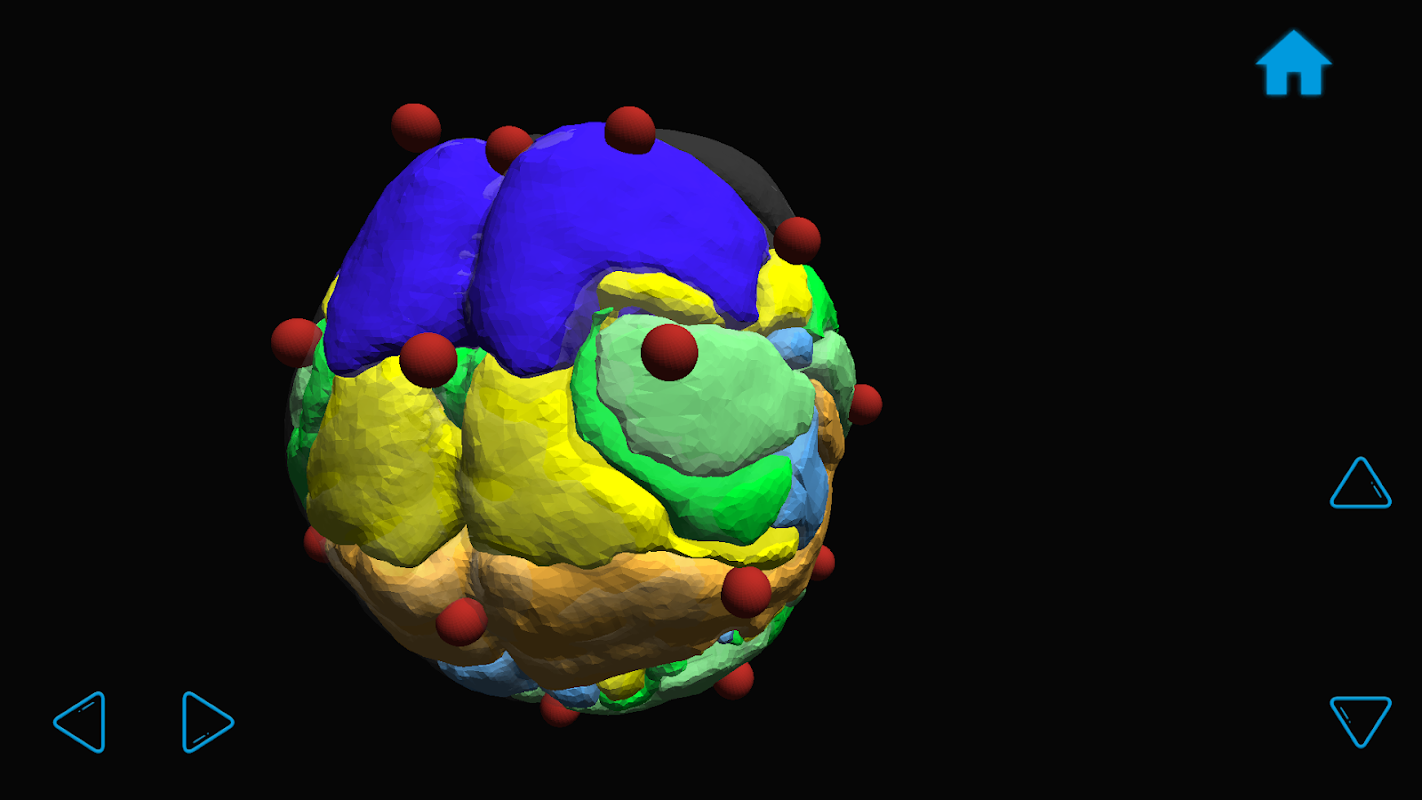 iBraiNEEG (intrinsic Brain Networks and EEG electrodes) application: The user view a 3D transparent brain with 7 standard functional connectivity networks and EEG 10-20 electrodes as red spheres over the brain. The user could rotate the brain using onscreen controls, and by tapping each electrode, the name of it appears on screen. By tapping the three points at the left side of the screen, the name of each functional network will appear.